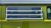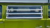 The exterior features the classic Westfalia pop-top, allowing for additional sleeping space and headroom. The jalousie windows provide ventilation, while the green paint and white wheels give it a timeless, iconic VW look.